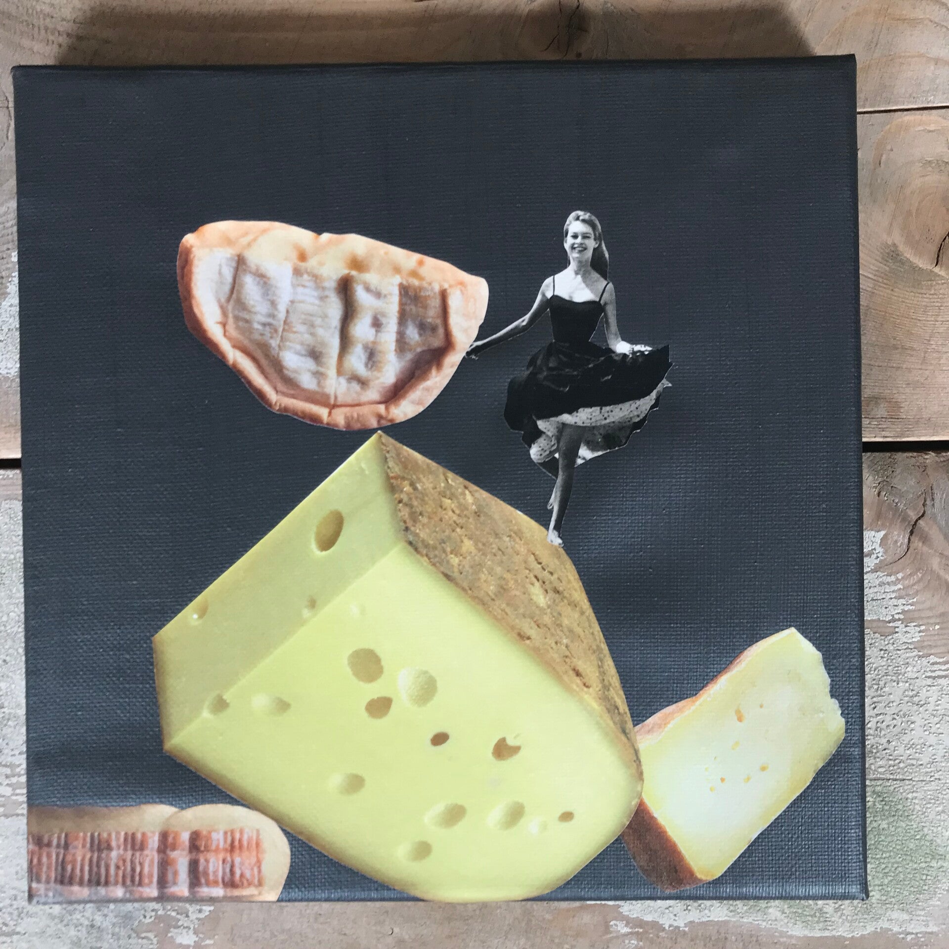 Unieke, handgeknipte en -geplakte collage op schildersdoek 20 X 20 x 1 cm.