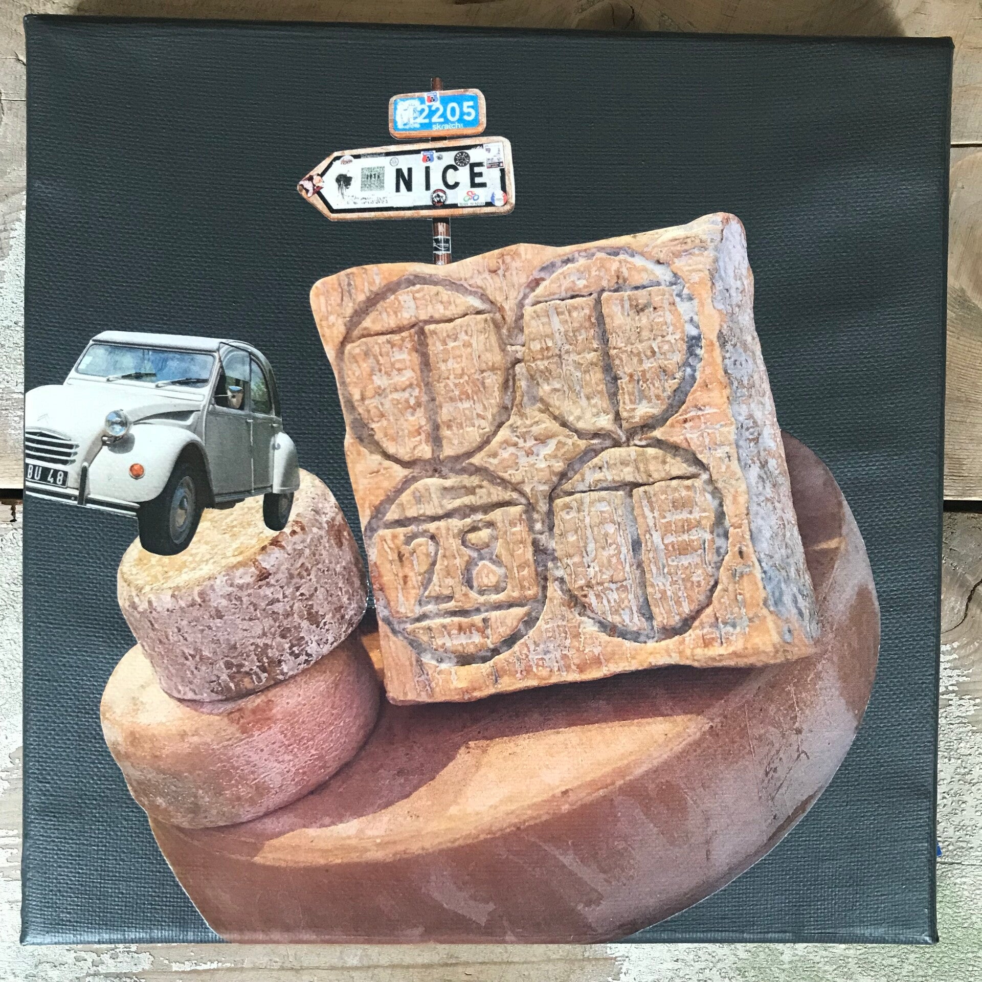 Unieke, handgeknipte en -geplakte collage op schildersdoek 20 X 20 x 1 cm.