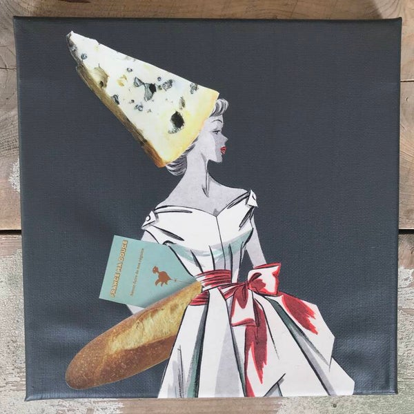 Unieke, handgeknipte en -geplakte collage op schildersdoek 20 X 20 x 1 cm.