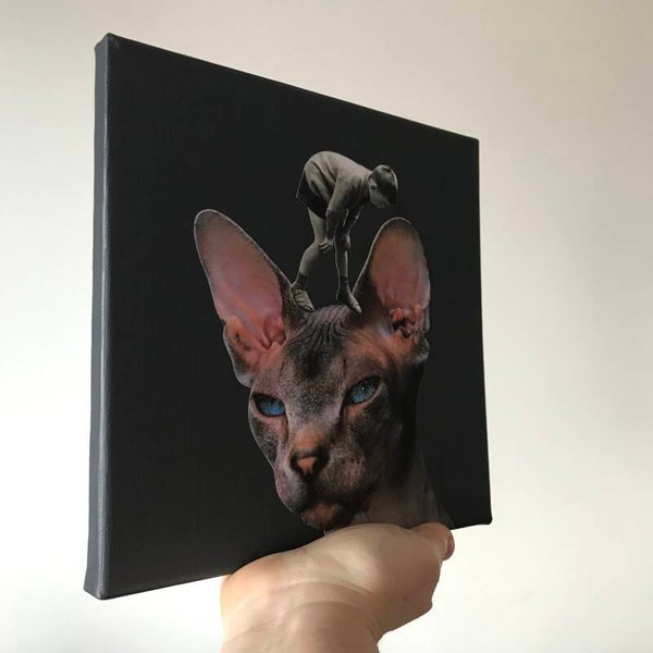 Unieke, handgeknipte en -geplakte collage op schildersdoek 20 X 20 x 1 cm.