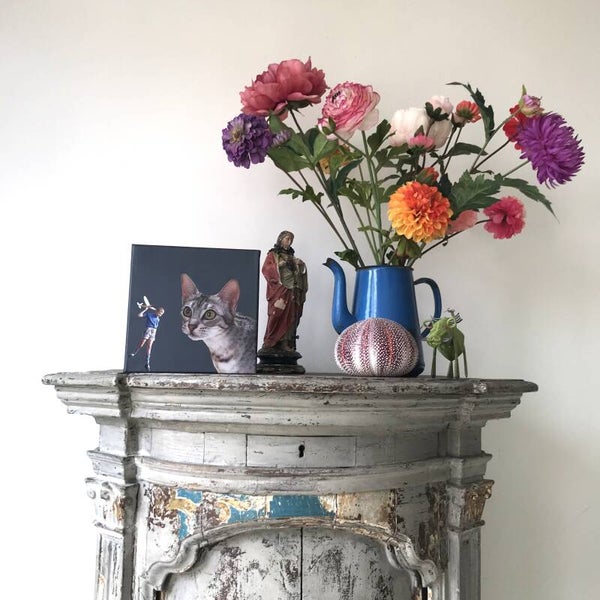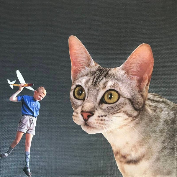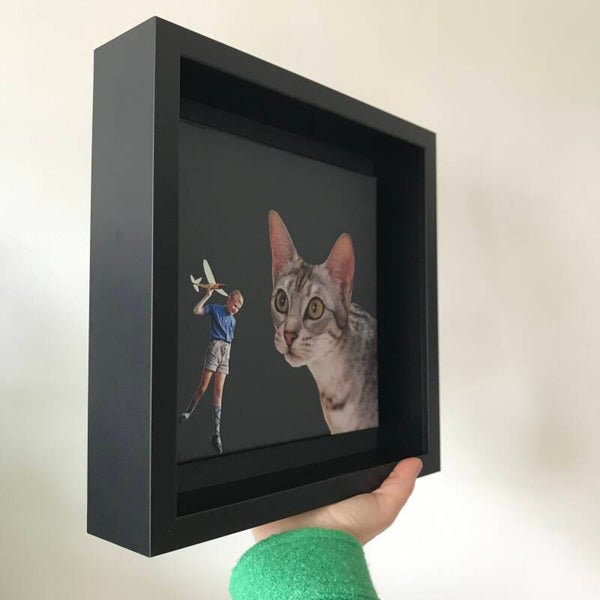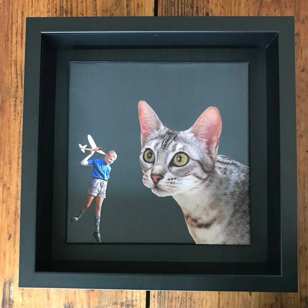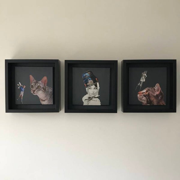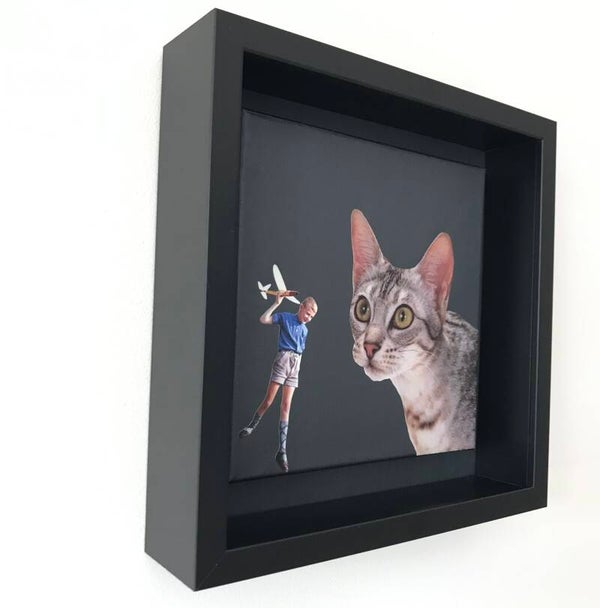 Unieke, handgeknipte en -geplakte collage op schildersdoek 20 X 20 x 1 cm, incl lijst 25x25x6 cm