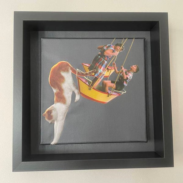 Unieke, handgeknipte en -geplakte collage op schildersdoek 20 X 20 x 1 cm.