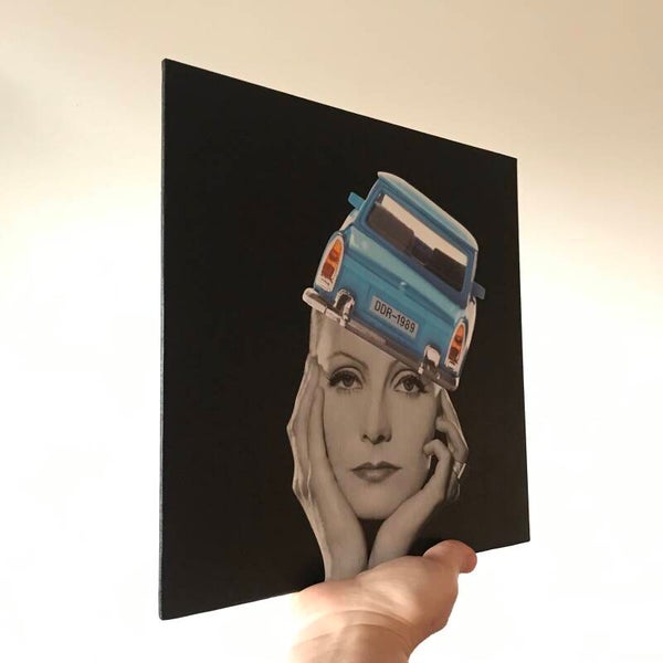 Unieke, handgeknipte en -geplakte collage op schildersdoek 25 X 25 x 0,3 cm.