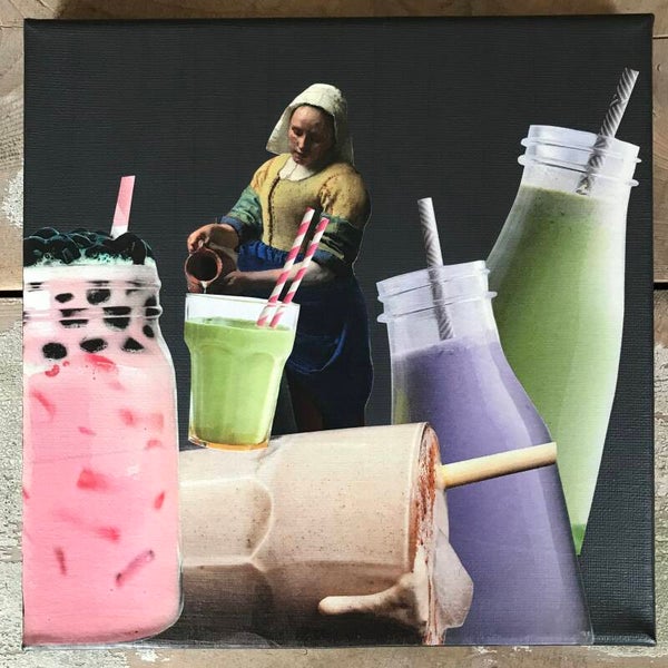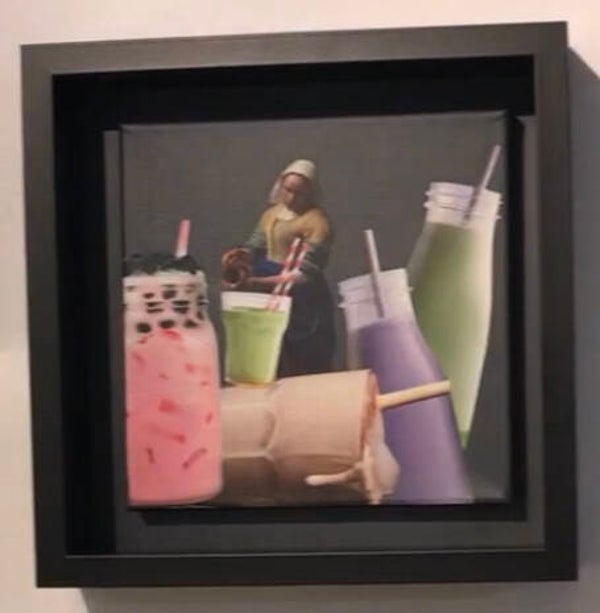 Het melkmeisje anno nu 20x20x1 cm incl lijst 25x25x6 cm