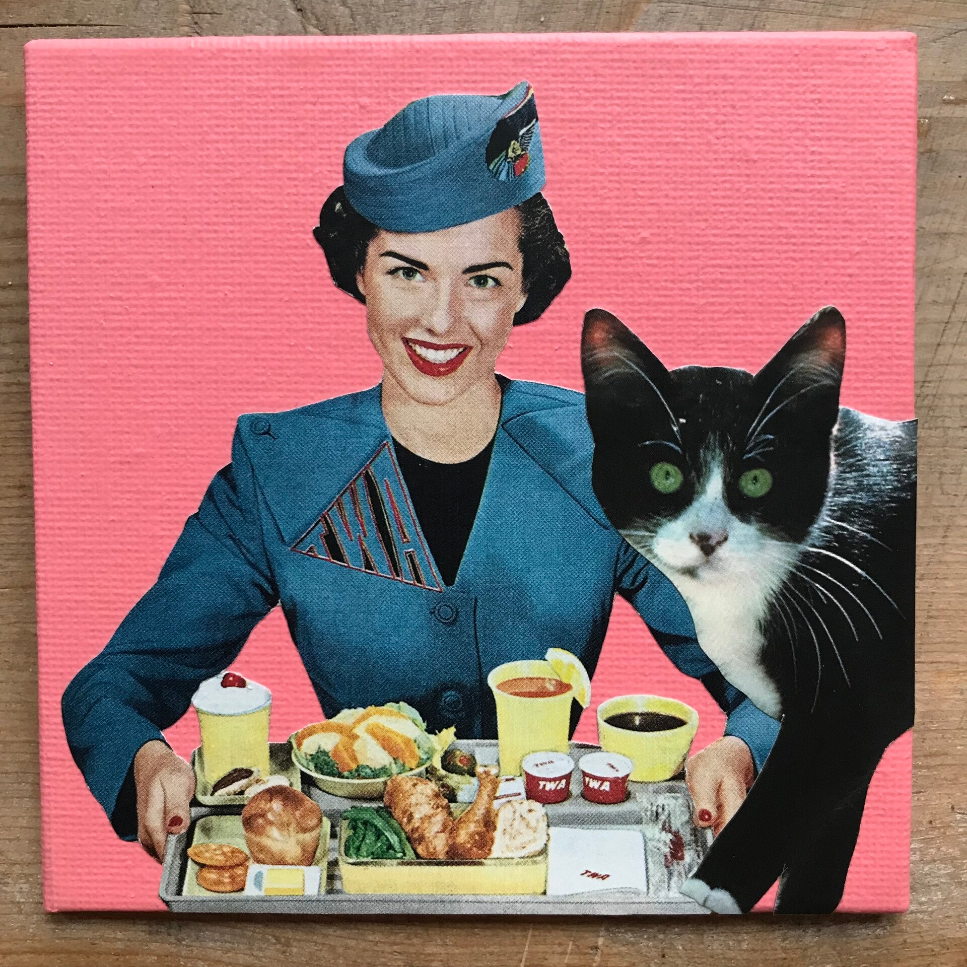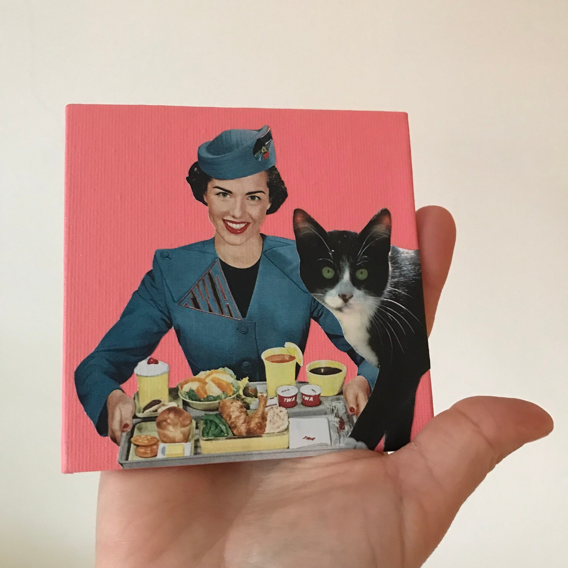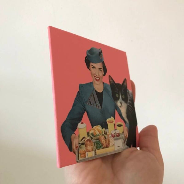 Unieke, handgeknipte en -geplakte collage op schildersbord 10x10x 0,3 cm. Inclusief ophangsysteem.