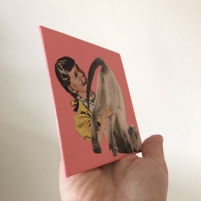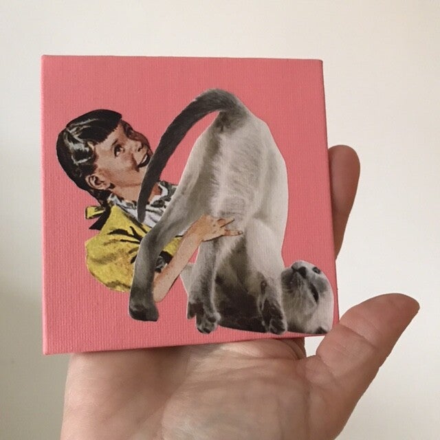 Unieke, handgeknipte en -geplakte collage op schildersbord 10x10x 0,3 cm. Inclusief ophangsysteem.