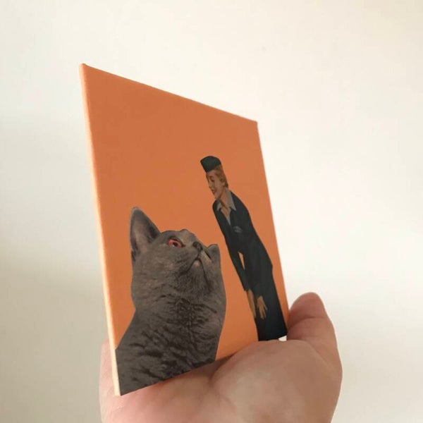 Unieke, handgeknipte en -geplakte collage op schildersbord 10x10x 0,3 cm. Inclusief ophangsysteem.