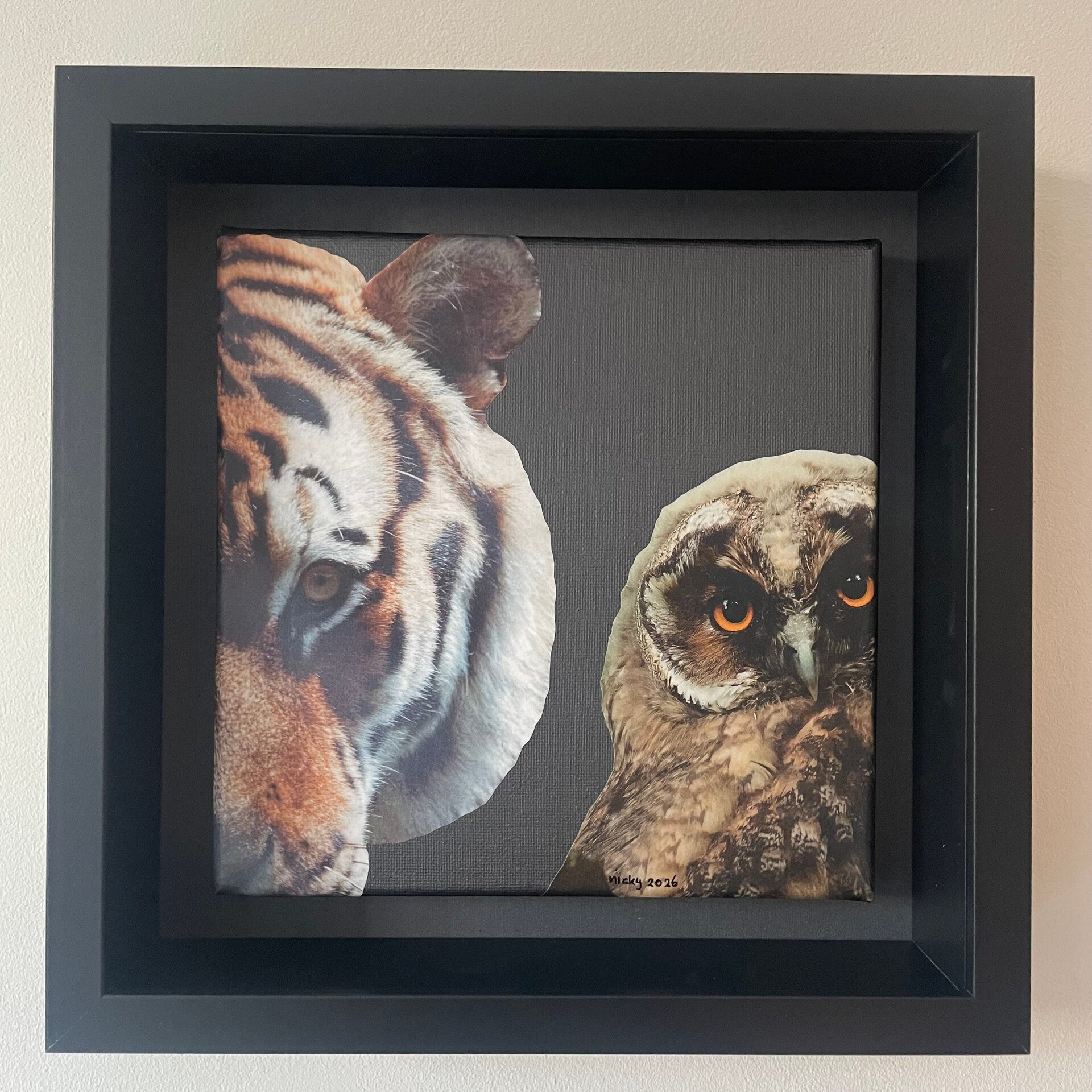 Unieke, handgeknipte collage op schilderdoek 20 X 20 x 1 cm.