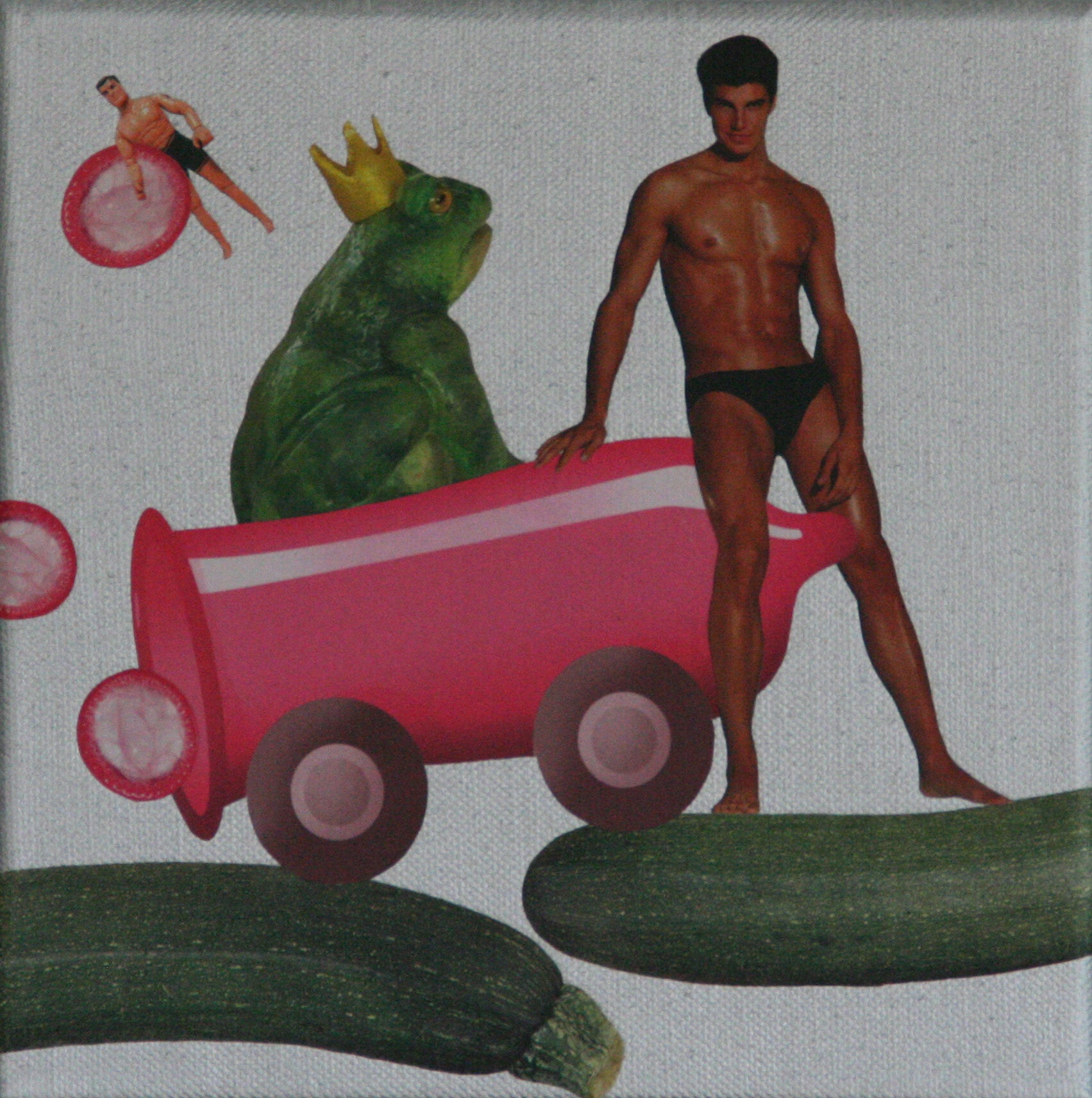 Unieke, handgeknipte en -geplakte collage op schildersdoek 20 X 20 x 1 cm.