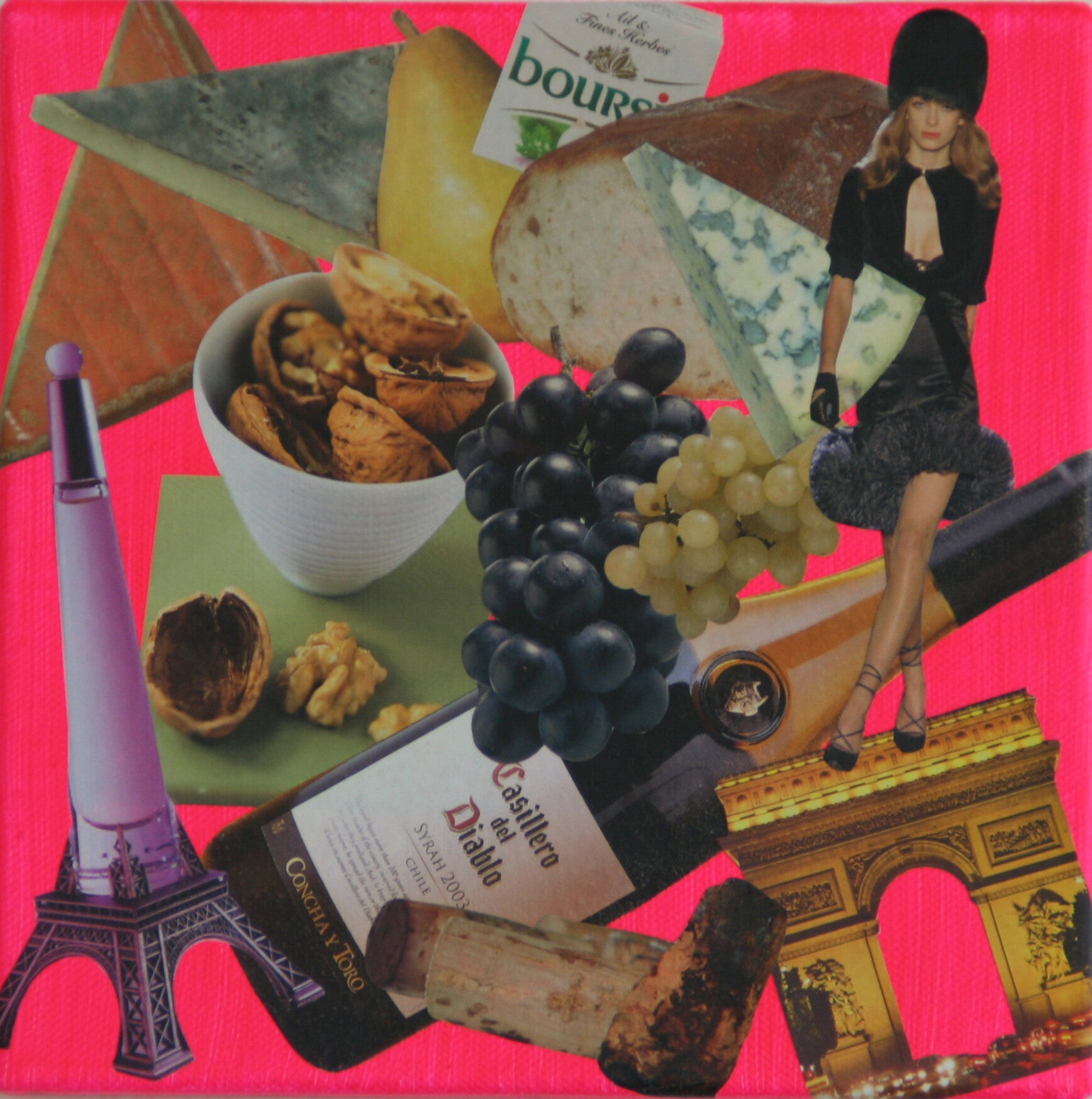 Unieke, handgeknipte en -geplakte collage op schildersdoek 20x20x1 cm.