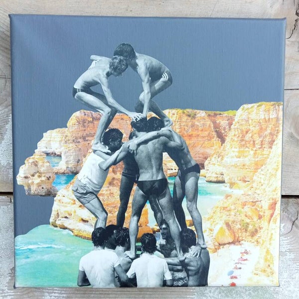 Unieke, handgeknipte en -geplakte collage op schildersdoek 20 x 20 x 1 cm.