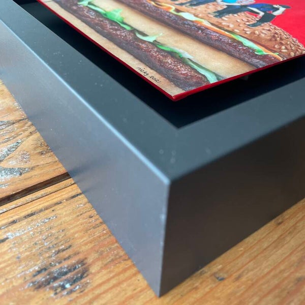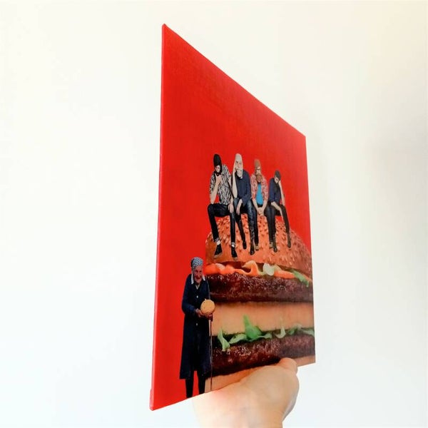 Unieke, handgeknipte en -geplakte collage op schildersdoek 25 X 25x 0,3 cm.