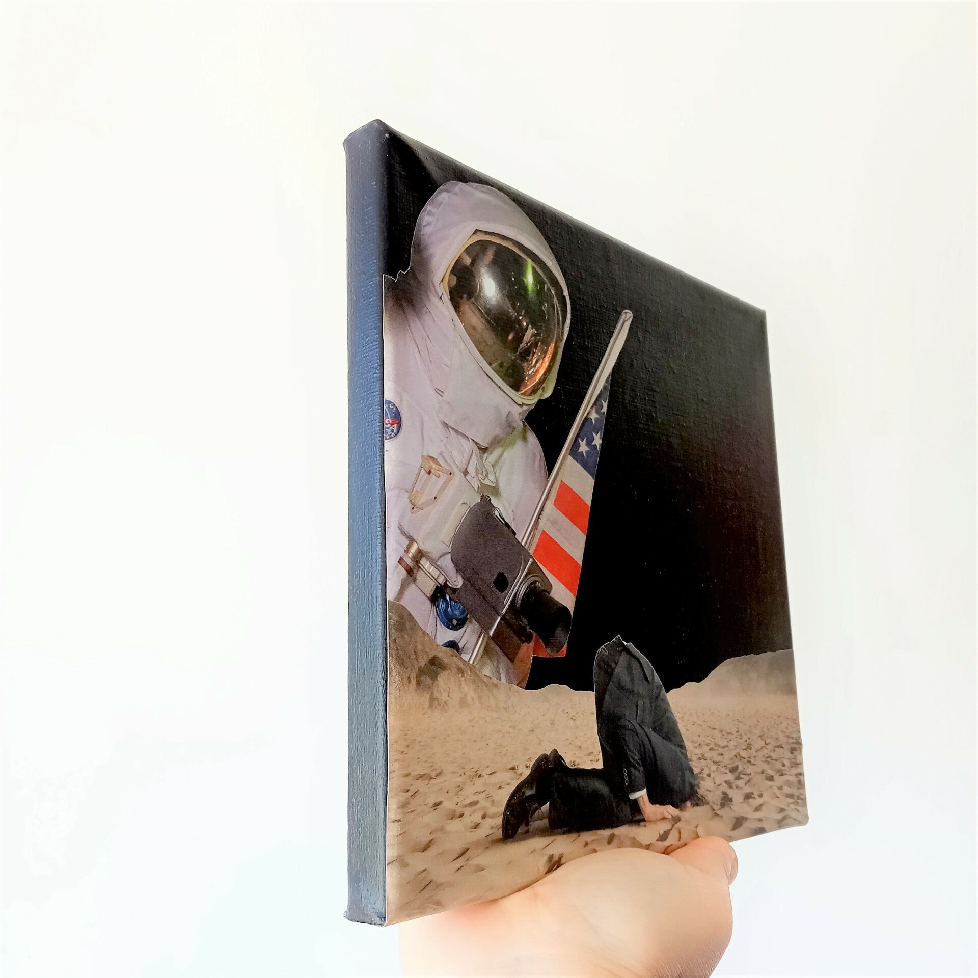 Unieke, handgeknipte en -geplakte collage op schildersdoek 20 X 20 x 1 cm.