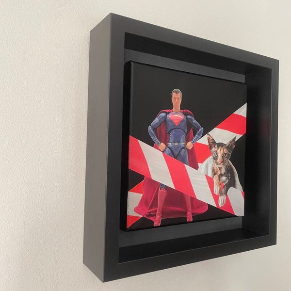 Unieke, handgeknipte en -geplakte collage op schildersdoek 20 X 20 x 1 cm.