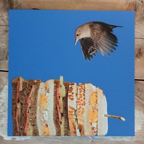 Unieke, handgeknipte en -geplakte collage op schildersdoek 25 X 25 x 0,3 cm.