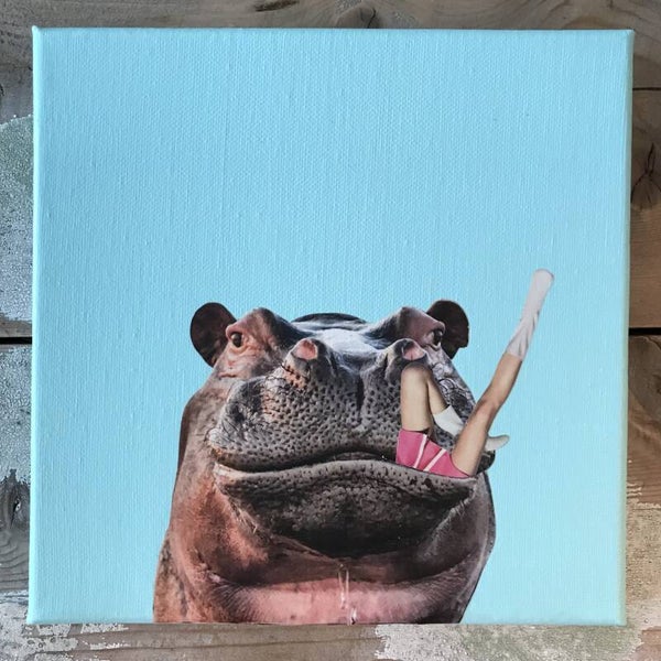 Unieke, handgeknipte en -geplakte collage op schildersdoek 20 x 20 x 1 cm. Inclusief ophangsysteem.