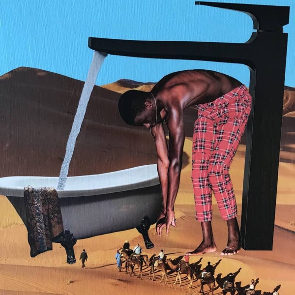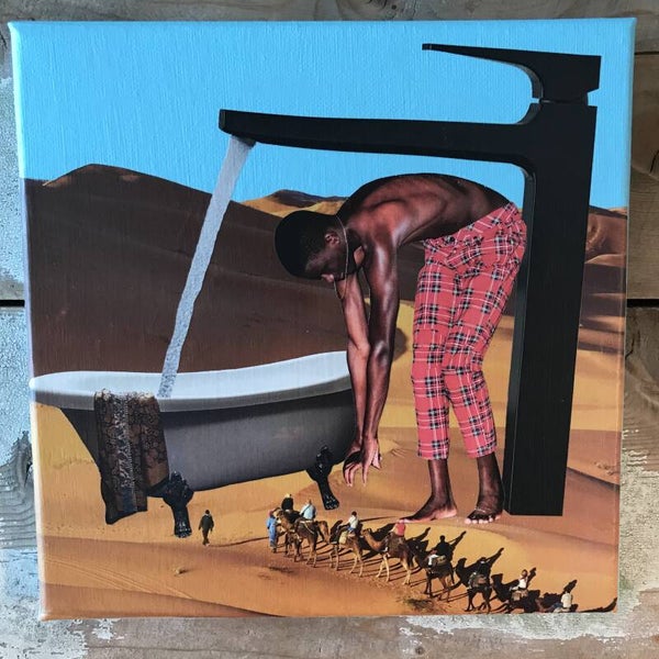 handgeknipte en -geplakte collage op schildersdoek 20 x 20 x 1 cm. Inclusief ophangsysteem.