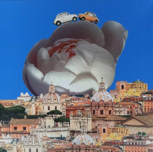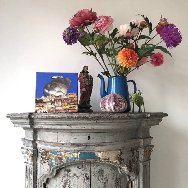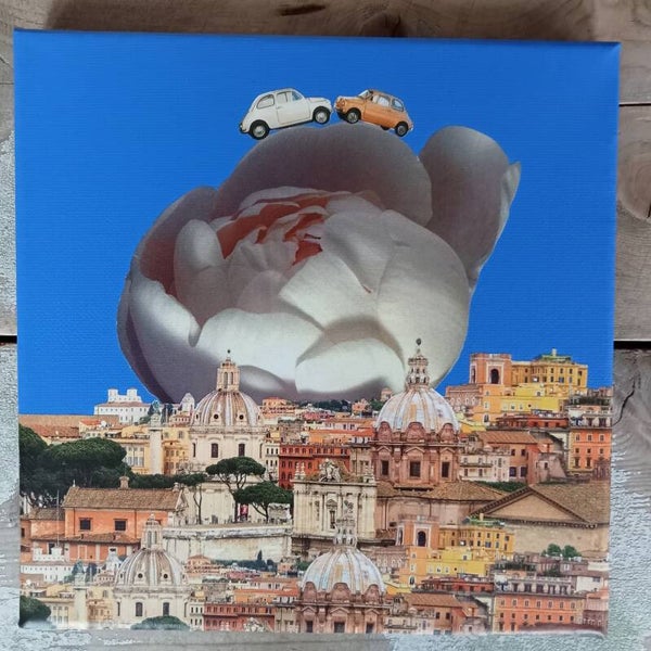 Unieke, handgeknipte en -geplakte collage op schildersdoek 20 X 20 X 1 cm.