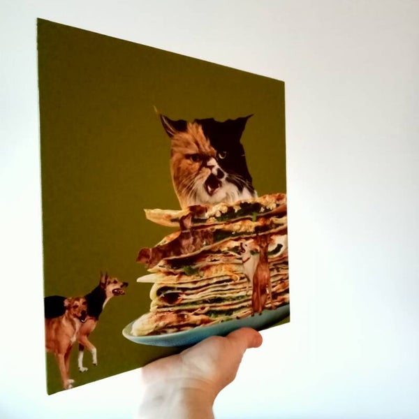 Unieke, handgeknipte en -geplakte collage op schildersdoek 20 X 20 X 1 cm.