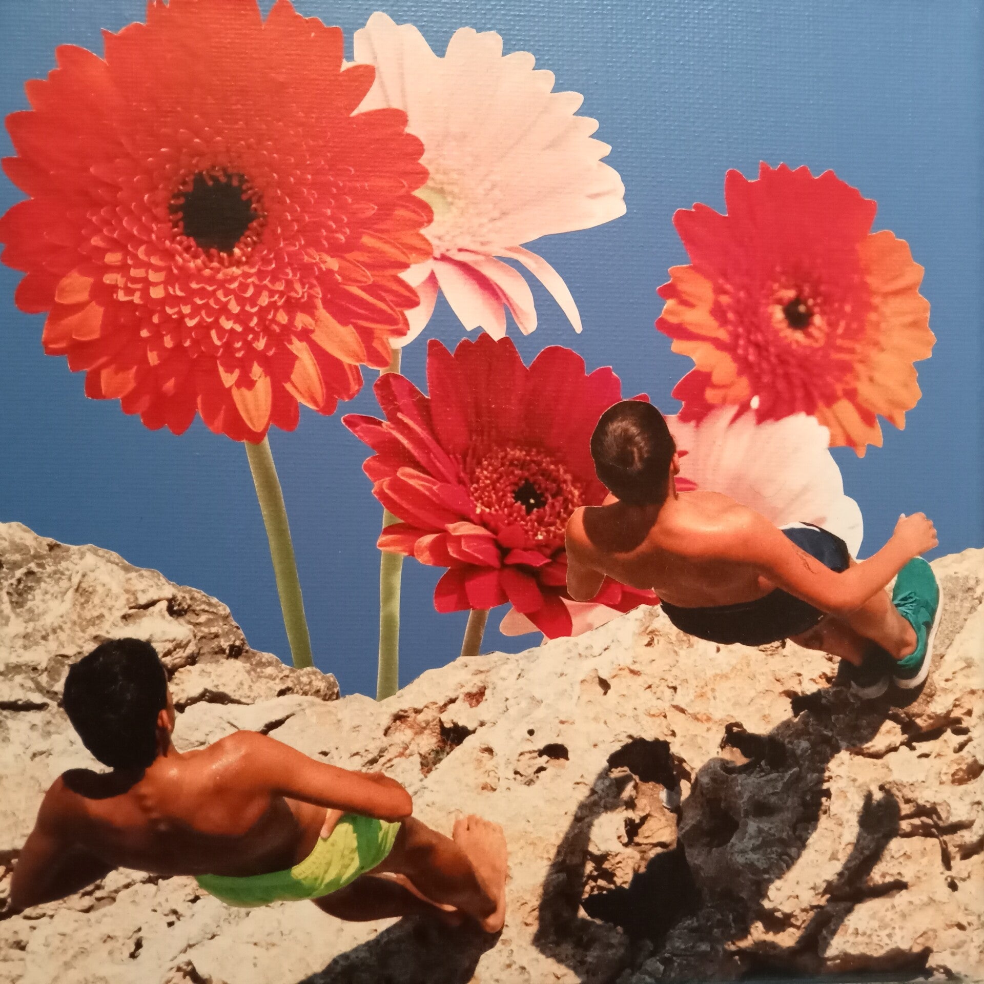 Unieke, handgeknipte en -geplakte collage op schildersdoek 20 X 20 X 1 cm.