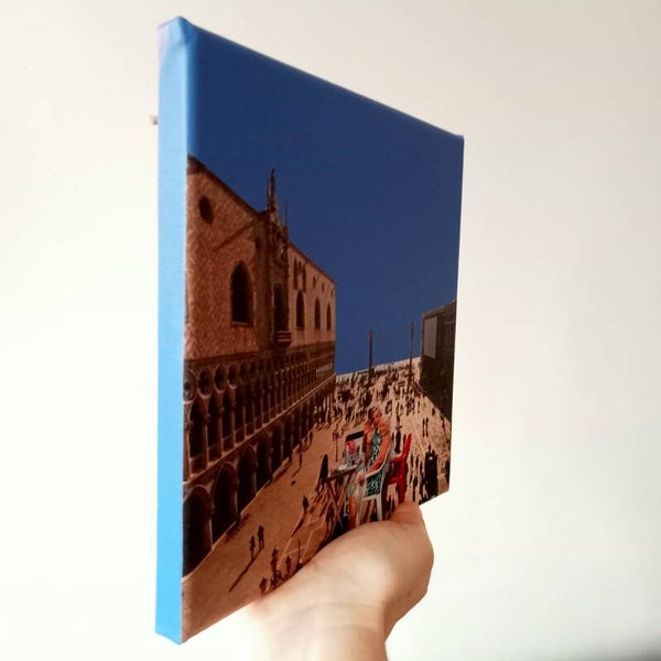 Unieke, handgeknipte en -geplakte collage op schildersdoek 20 X 20 X 1 cm.