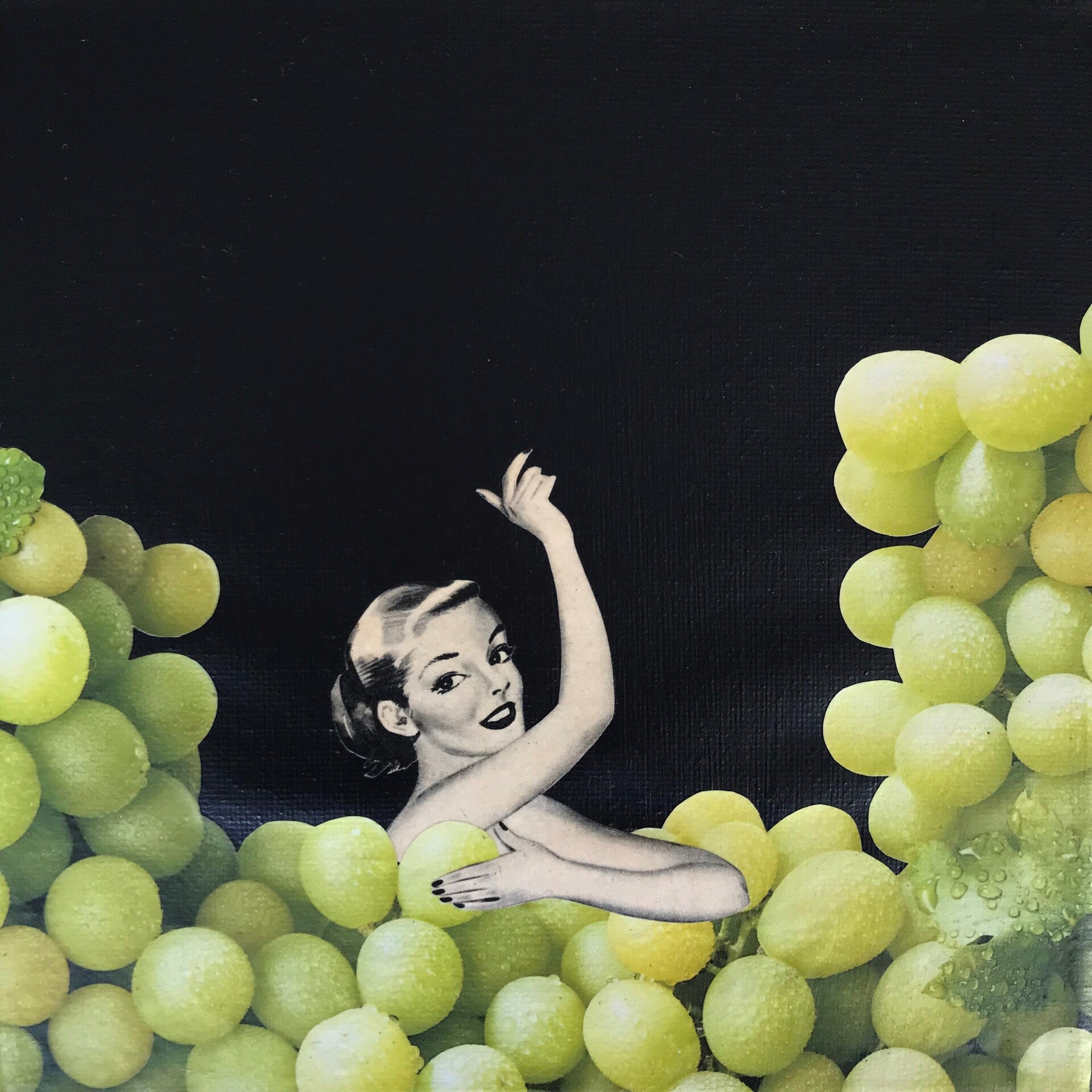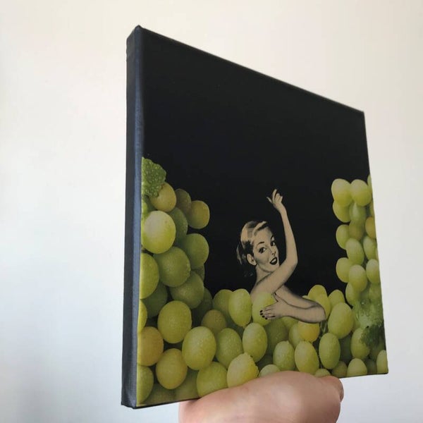 Unieke, handgeknipte en -geplakte collage op schildersdoek 20 X 20 x 1 cm.