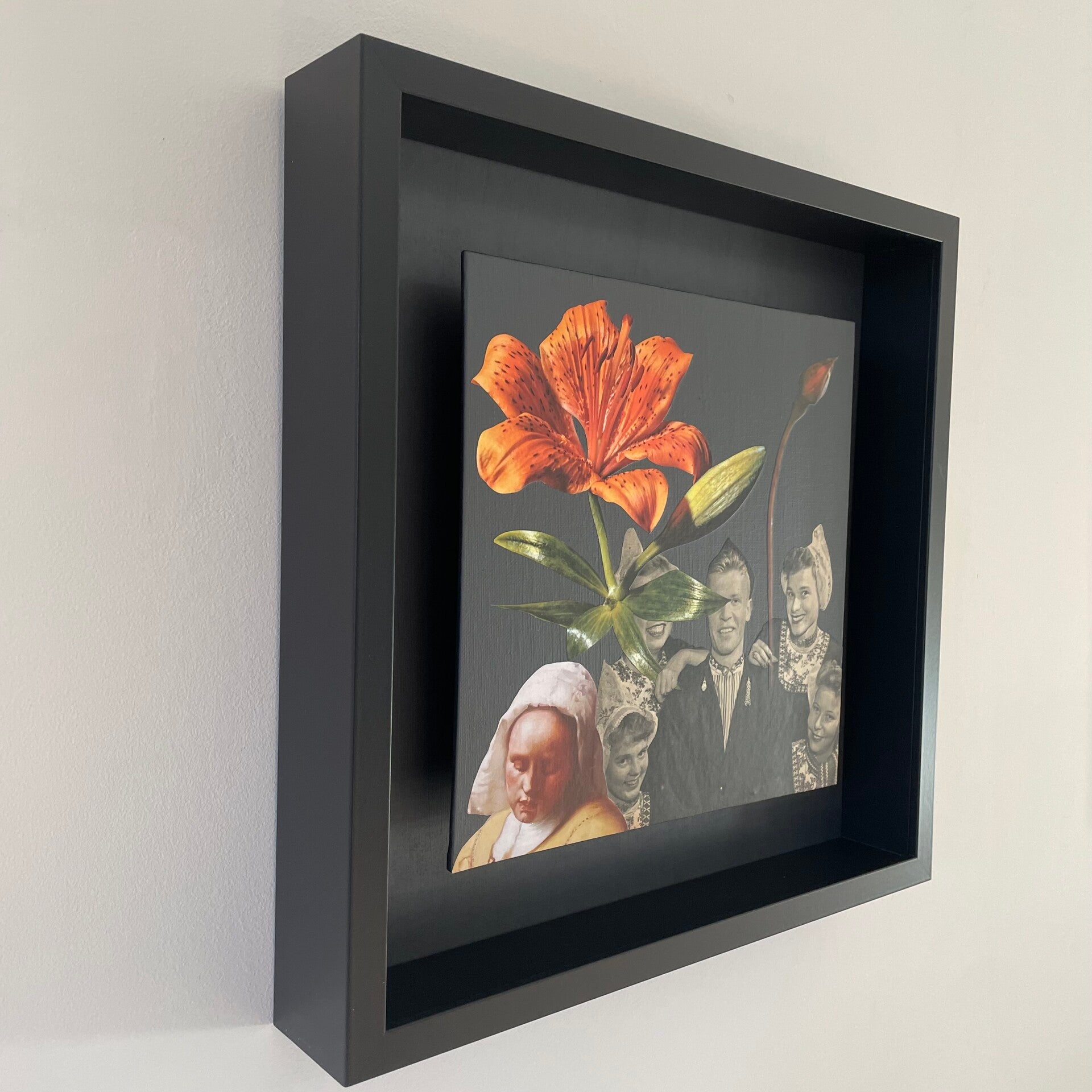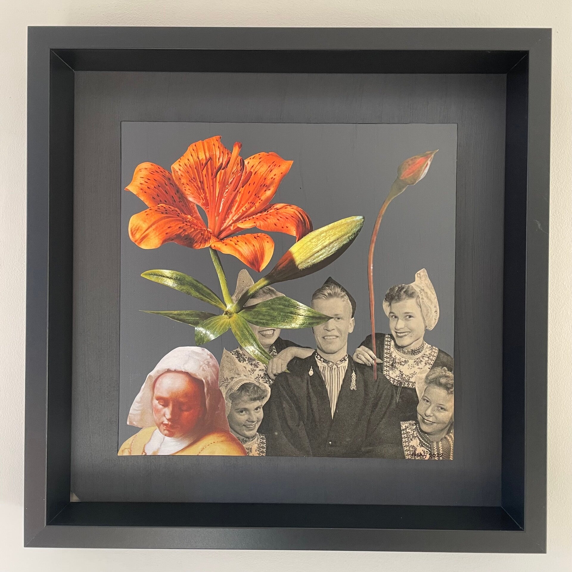 Unieke, handgeknipte en -geplakte collage op schildersdoek 25 X 25 x 0,3 cm.