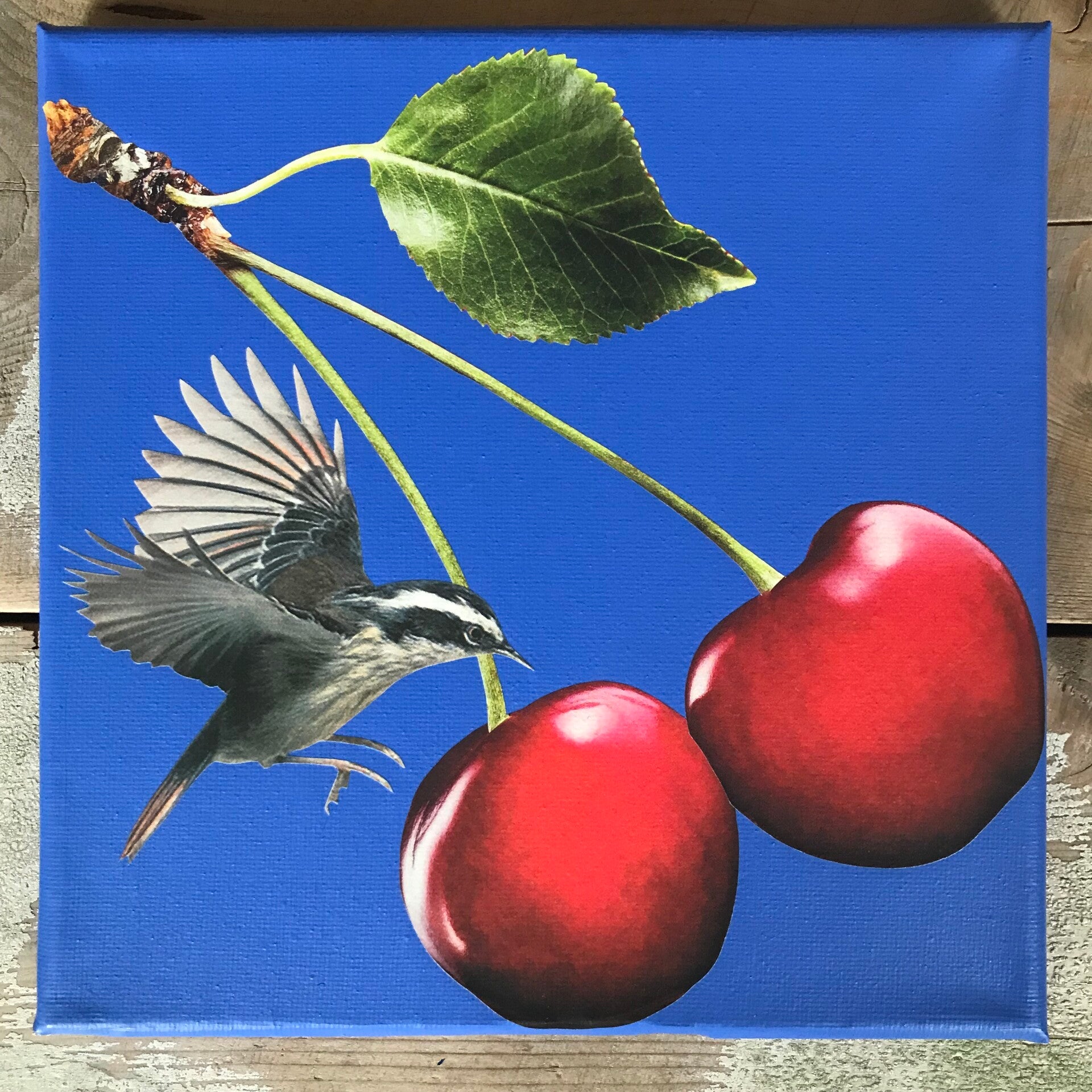 Unieke, handgeknipte en -geplakte collage op schildersdoek 20 X 20 X 1 cm.