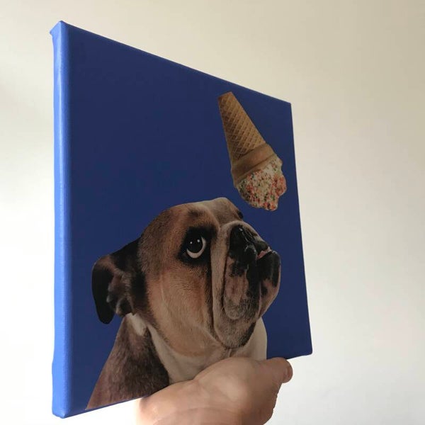 Unieke, handgeknipte en -geplakte collage op schildersdoek 20 X 20 X 1 cm.