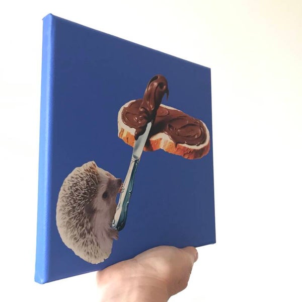 Unieke, handgeknipte en -geplakte collage op schildersdoek 20 X 20 X 1 cm.