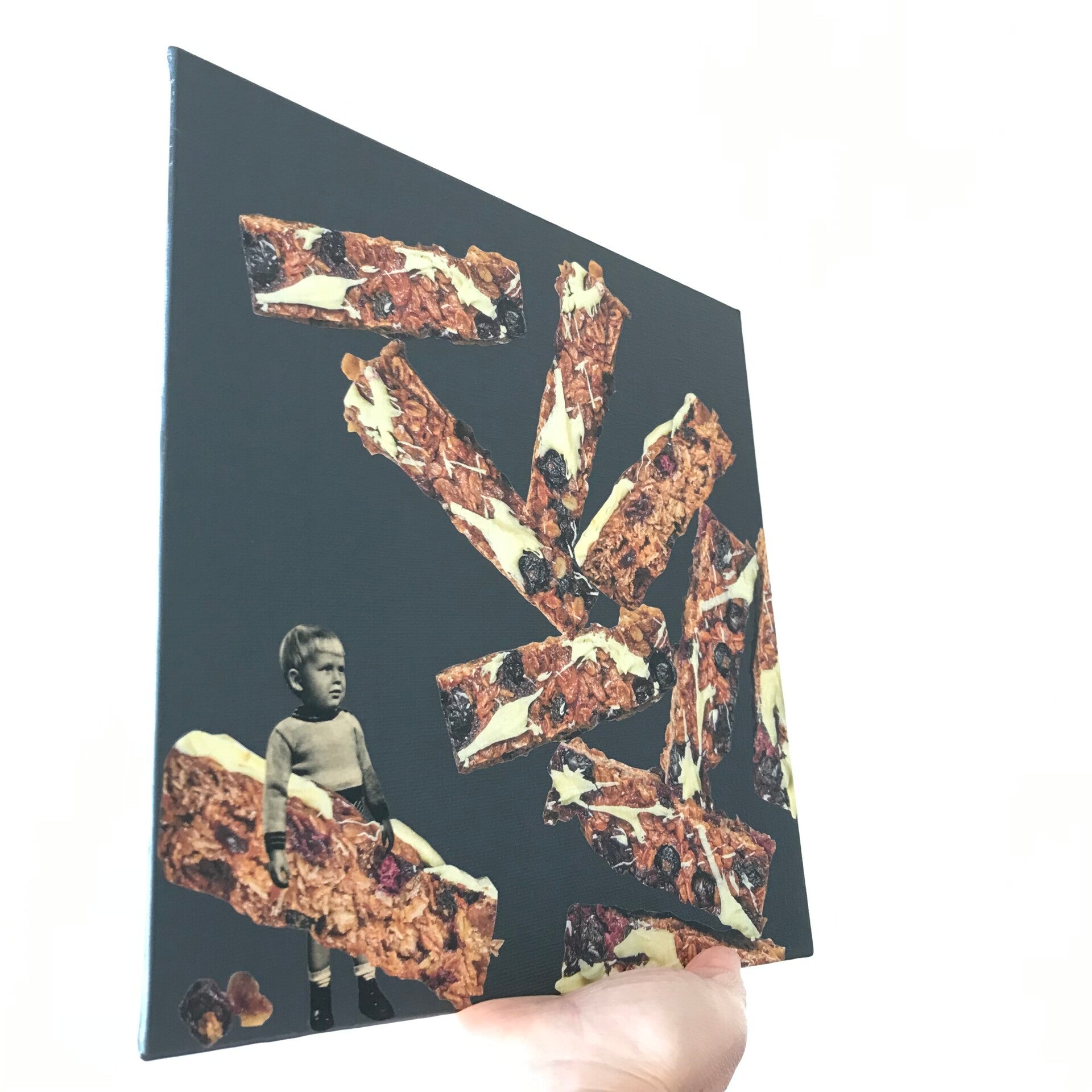 Unieke, handgeknipte en -geplakte collage op schildersdoek 25 X 25 x 0,3 cm.