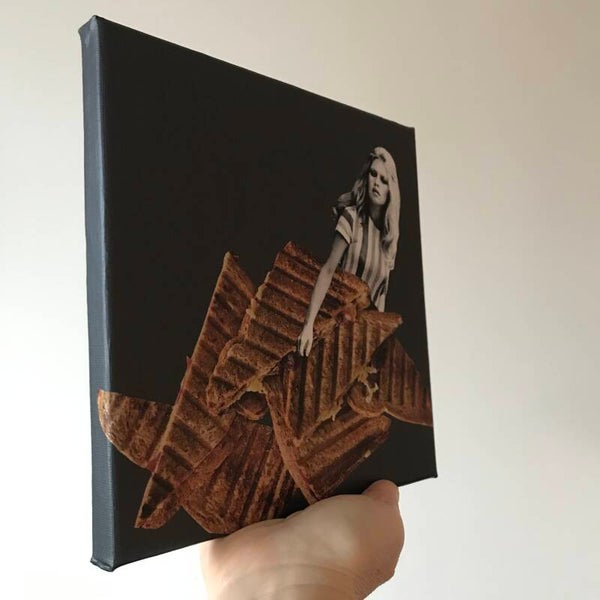 Unieke, handgeknipte en -geplakte collage op schildersdoek 20 X 20 X 1 cm.