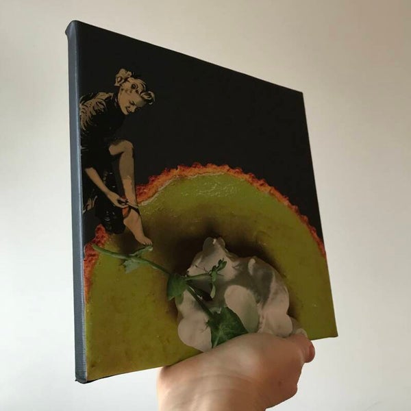 Unieke, handgeknipte en -geplakte collage op schildersdoek 20 X 20 X 1 cm.