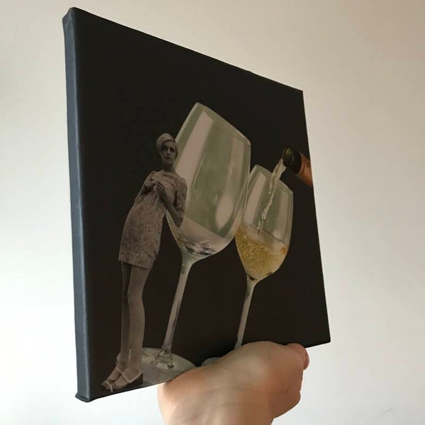 Unieke, handgeknipte en -geplakte collage op schildersdoek 20 X 20 X 1 cm.